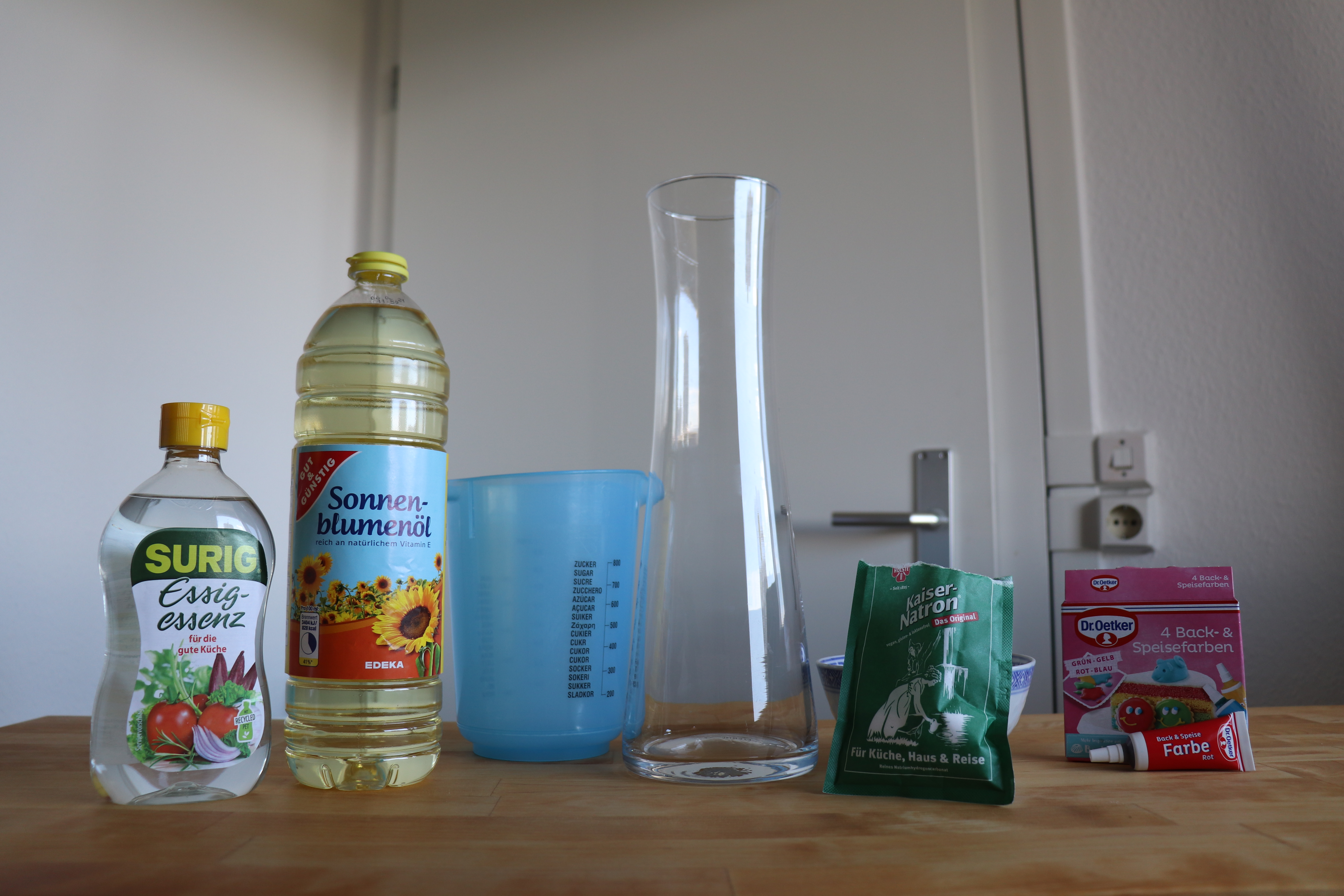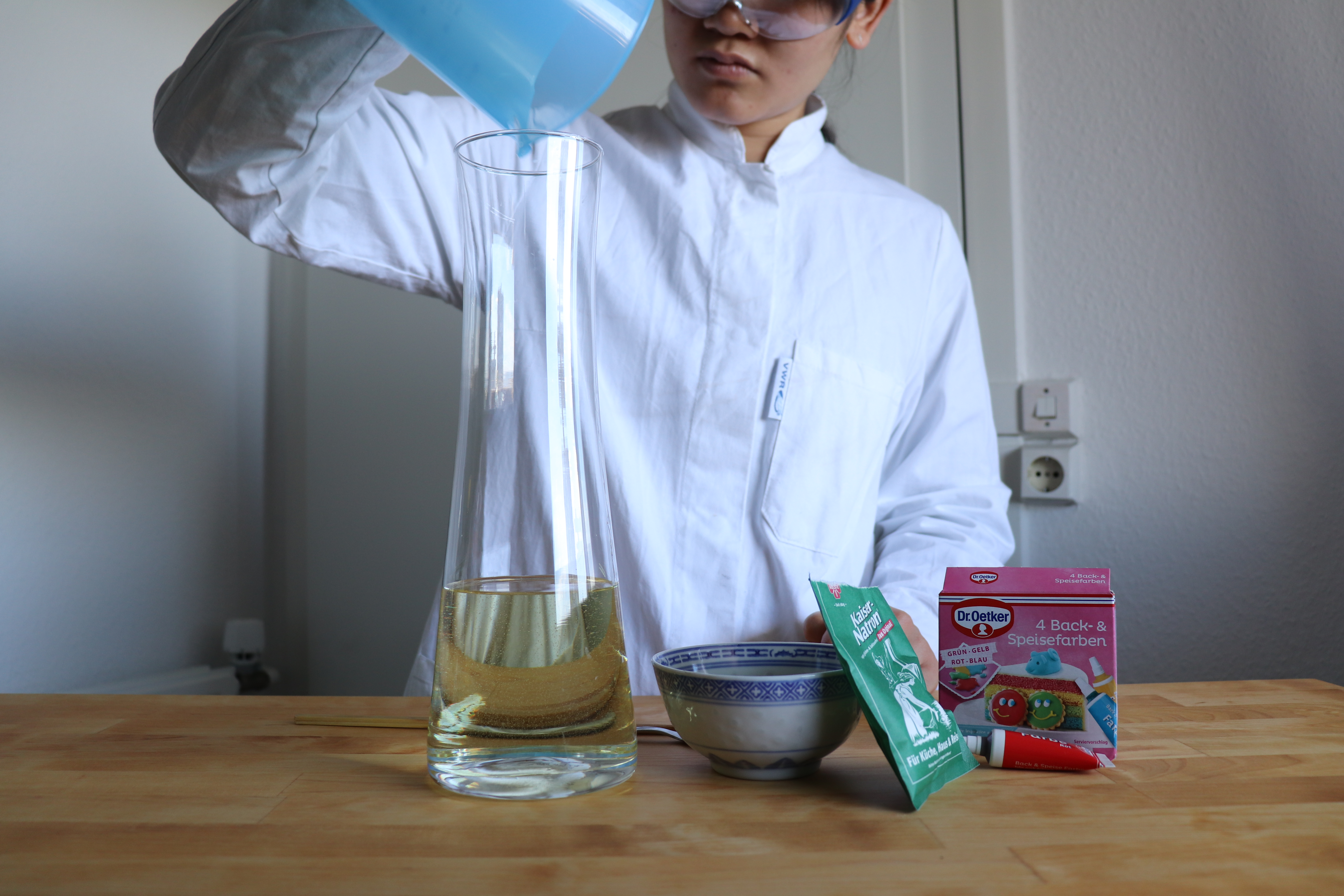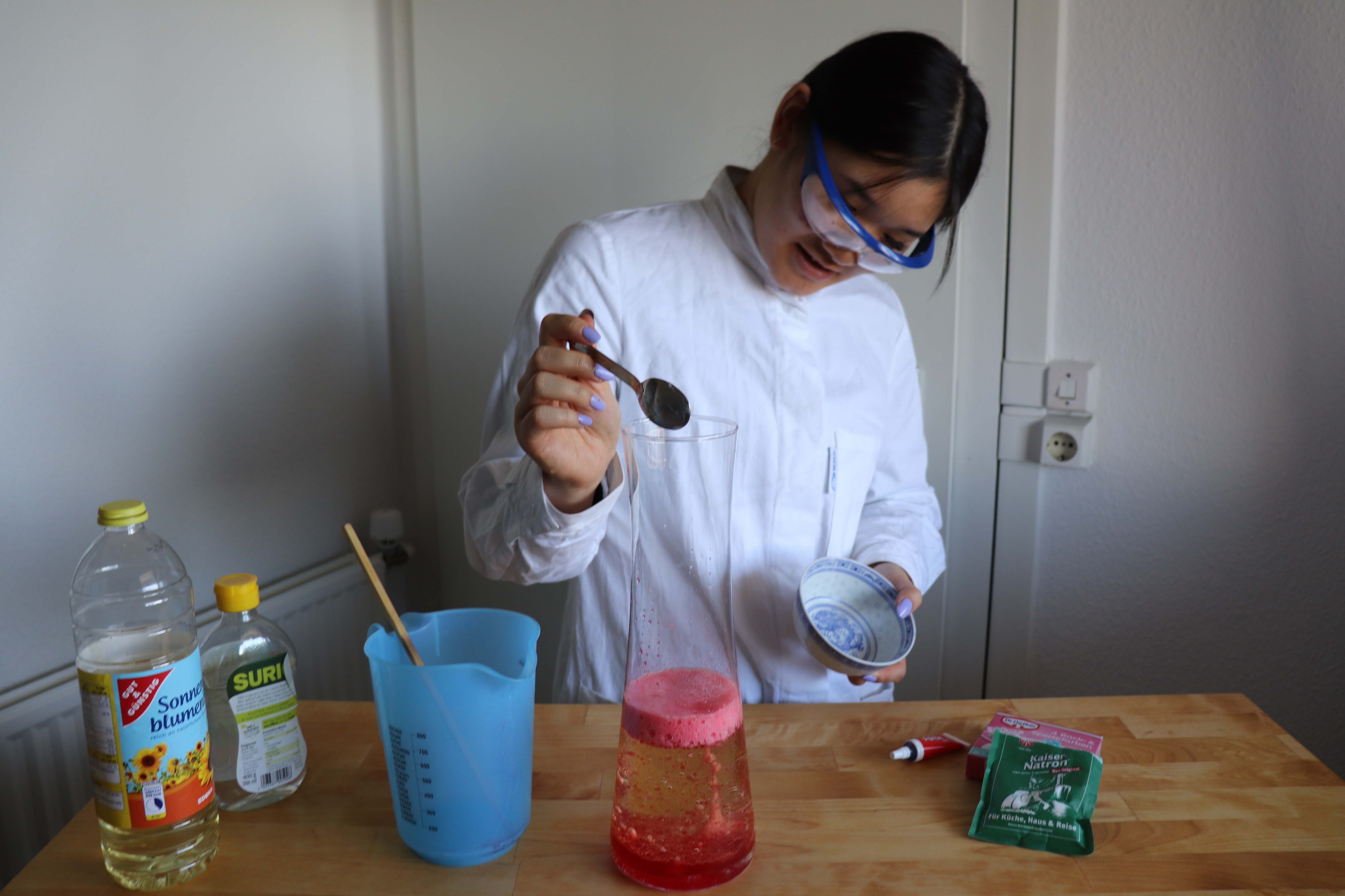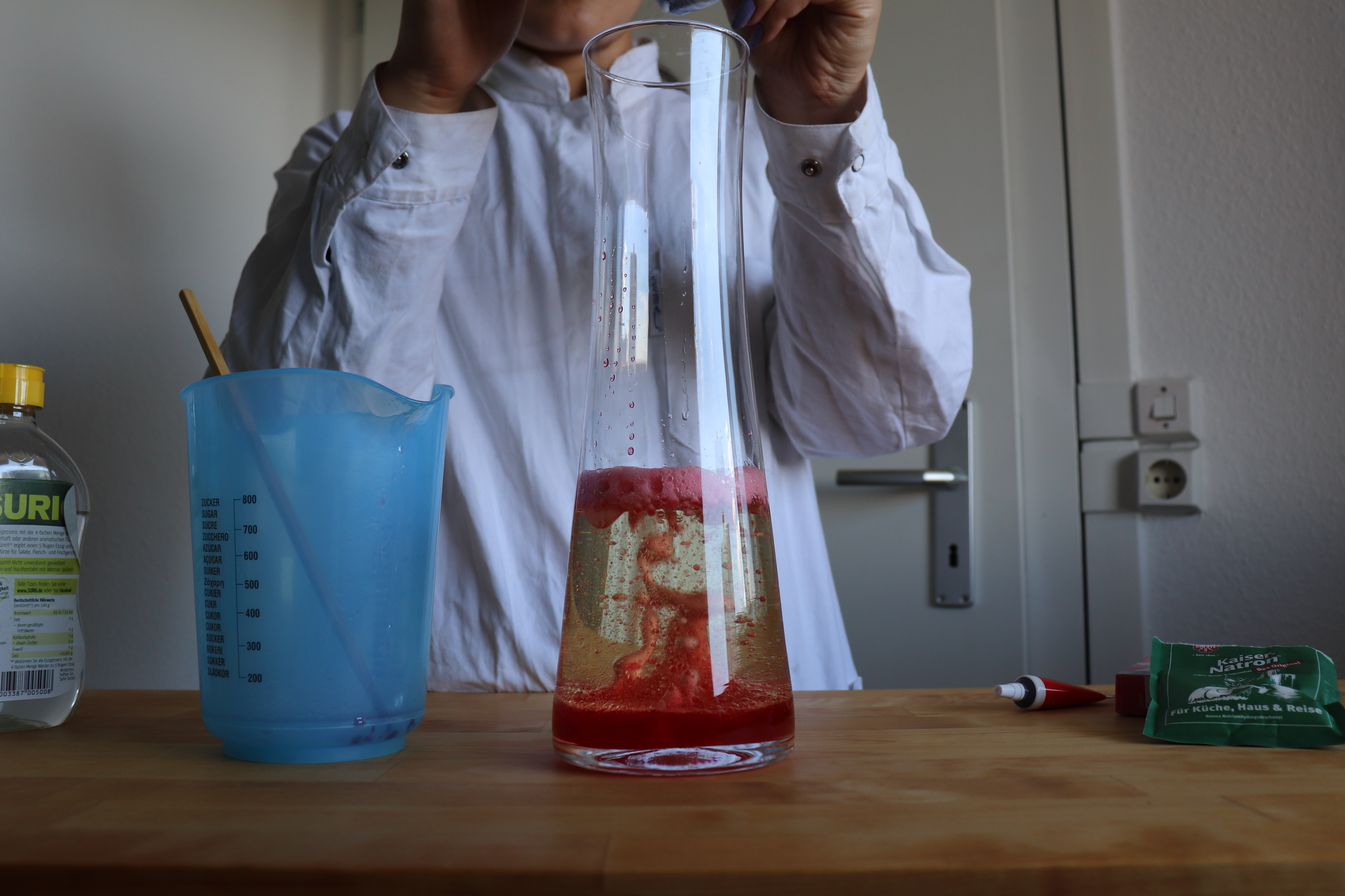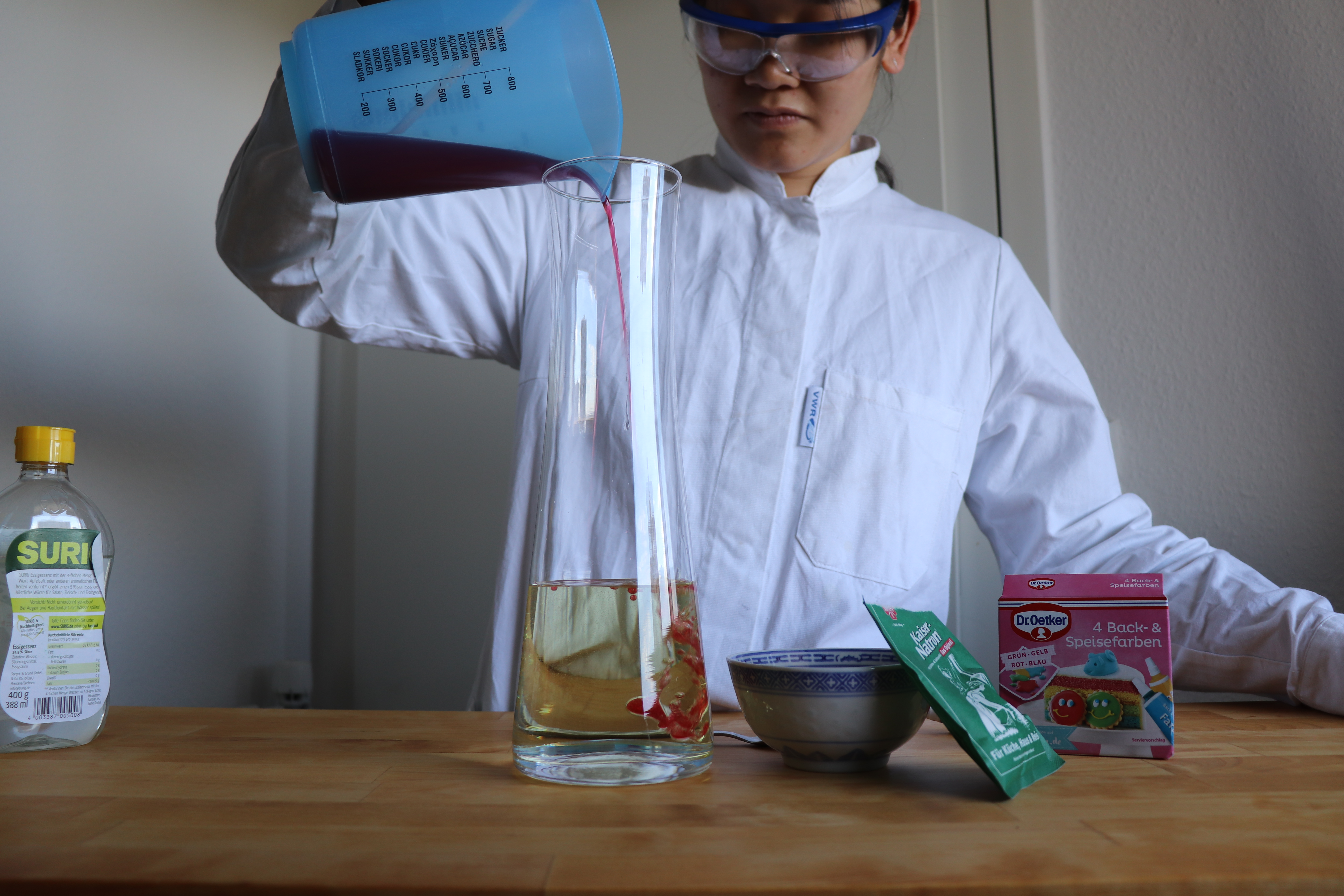 2.) Nun gebt ihr den Essig hinein, welchen ihr vorher mit Lebensmittelfarbe rot gefärbt habt.